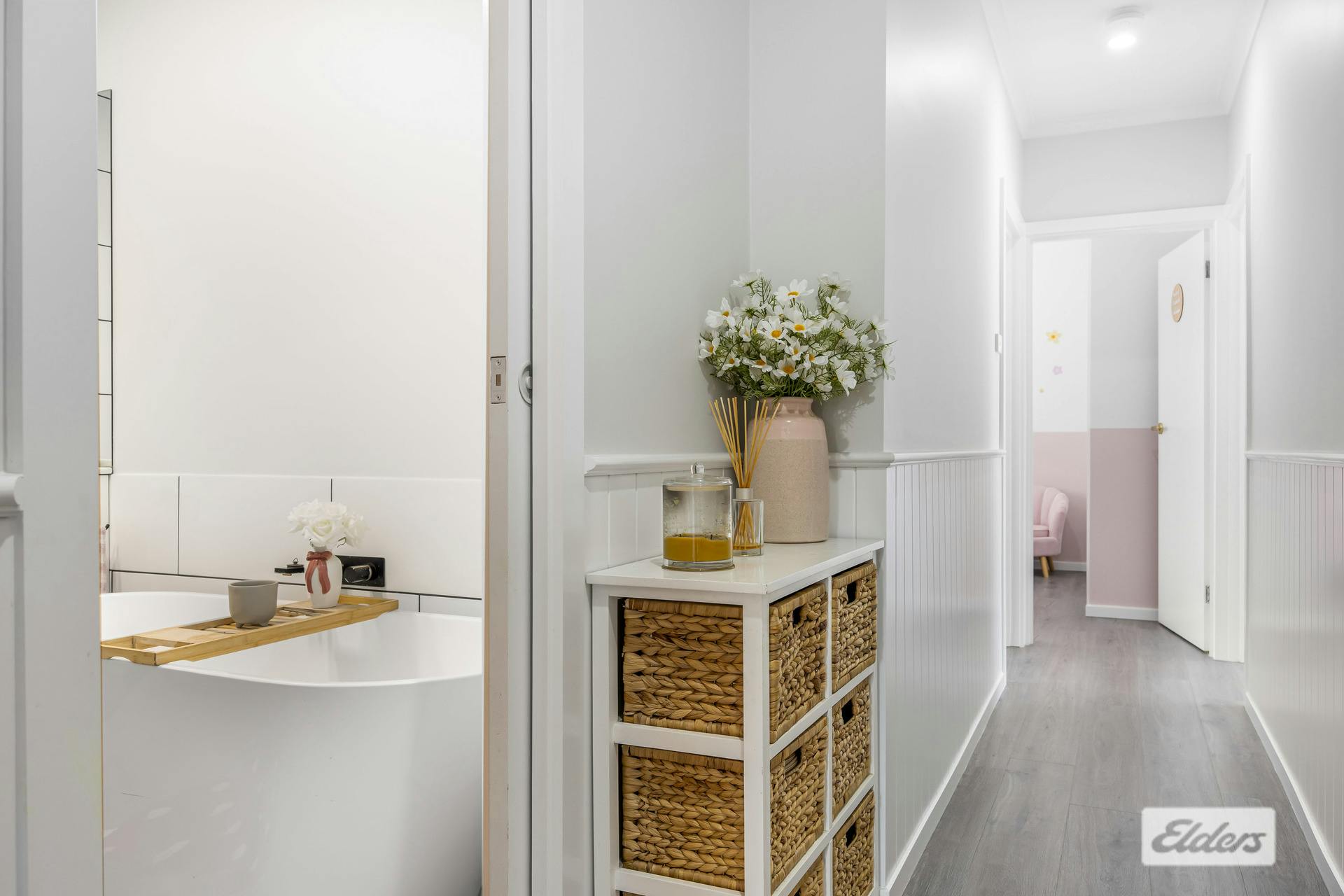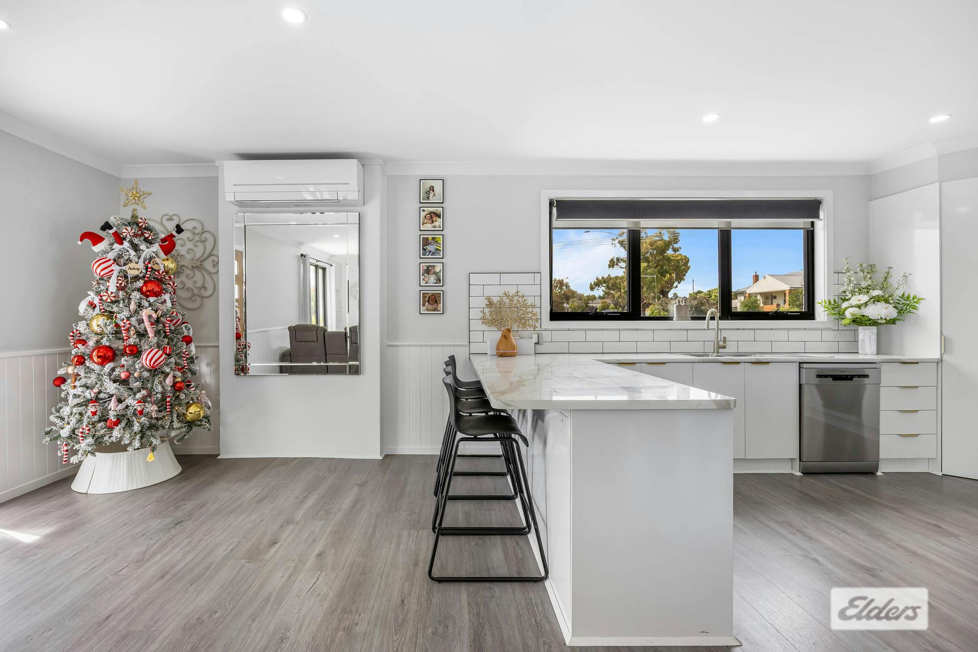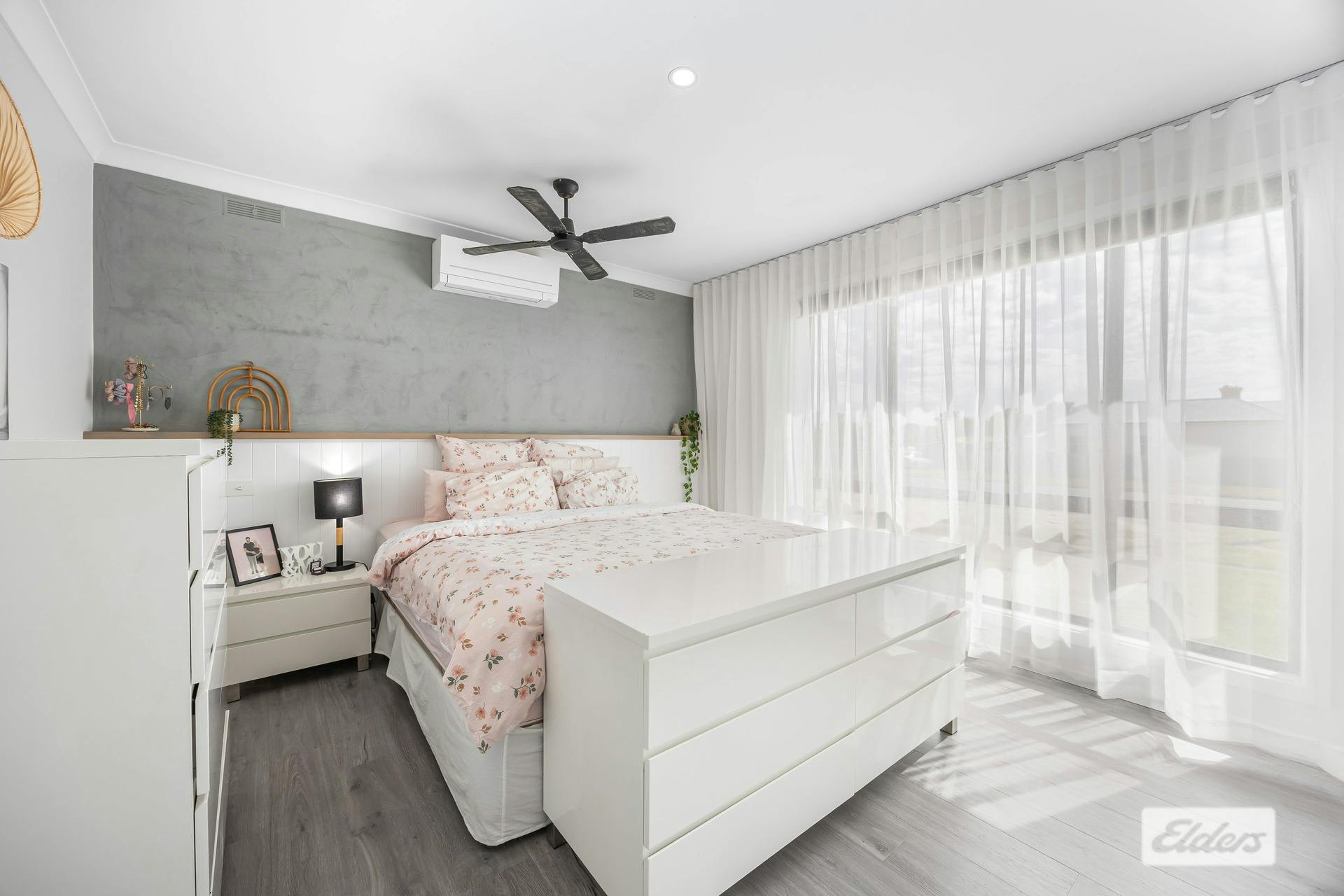 Offering three cleverly designed bedrooms, headlined by a luxurious master suite featuring wall-to-wall built in robe, a ceiling fan, split system air conditioner, a stylish half-height feature wall and shelf, and soft floor-to-ceiling sheers that create an elegant and calming retreat. Two additional bedrooms are equally well finished, each complemented by feature walls and floor-to-ceiling sheers, with one also offering the convenience of a built-in robe.
